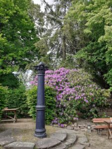 800 qm mit über 20 Pfingstrosen, zahlreichen Kletter- und Ramblerrosen, aufgelockert mit Sträuchern und Stauden, bieten mit romantischen Lauben- und Sitzplätzen die Gelegenheit zum Entspannen: Kommen – Schauen und Genießen.